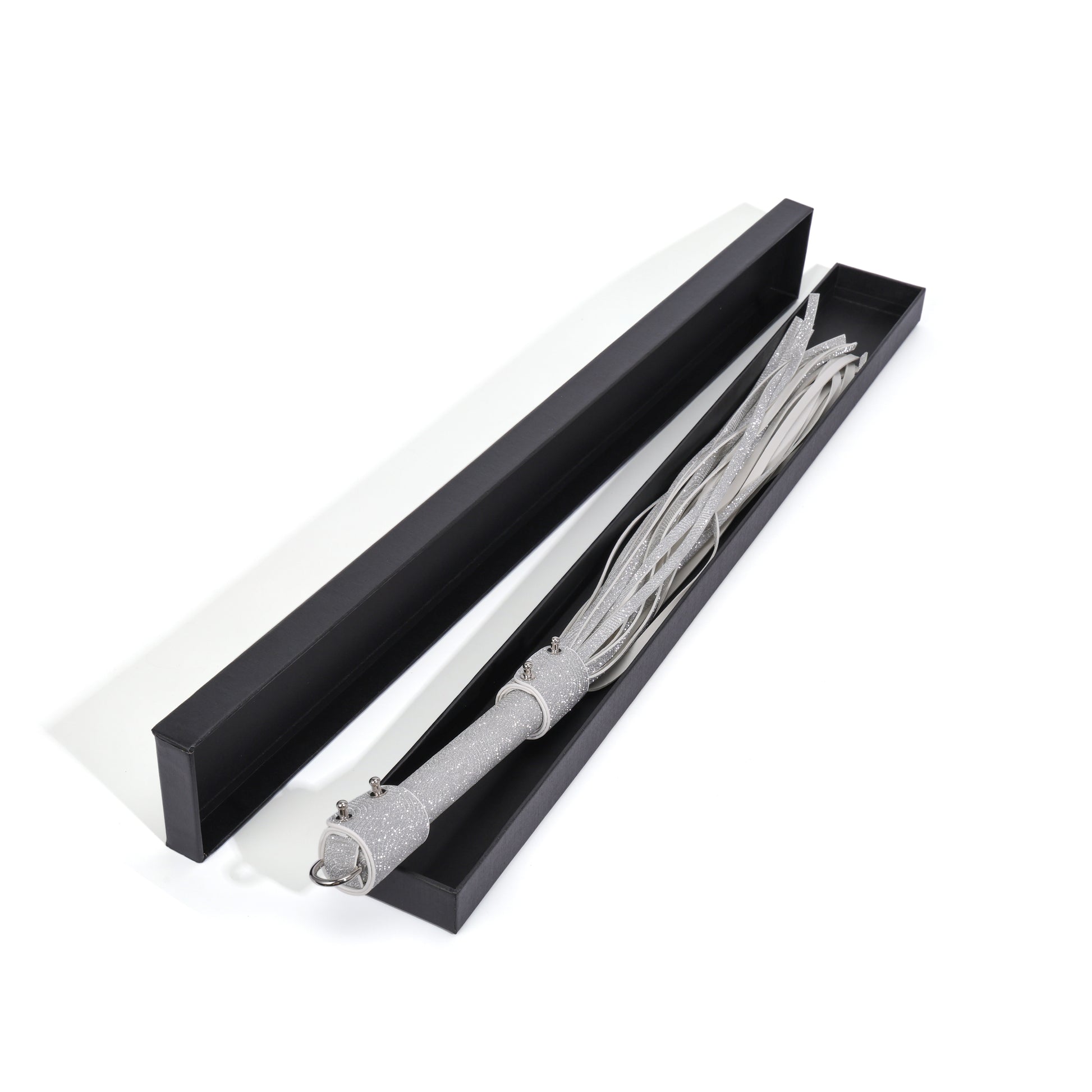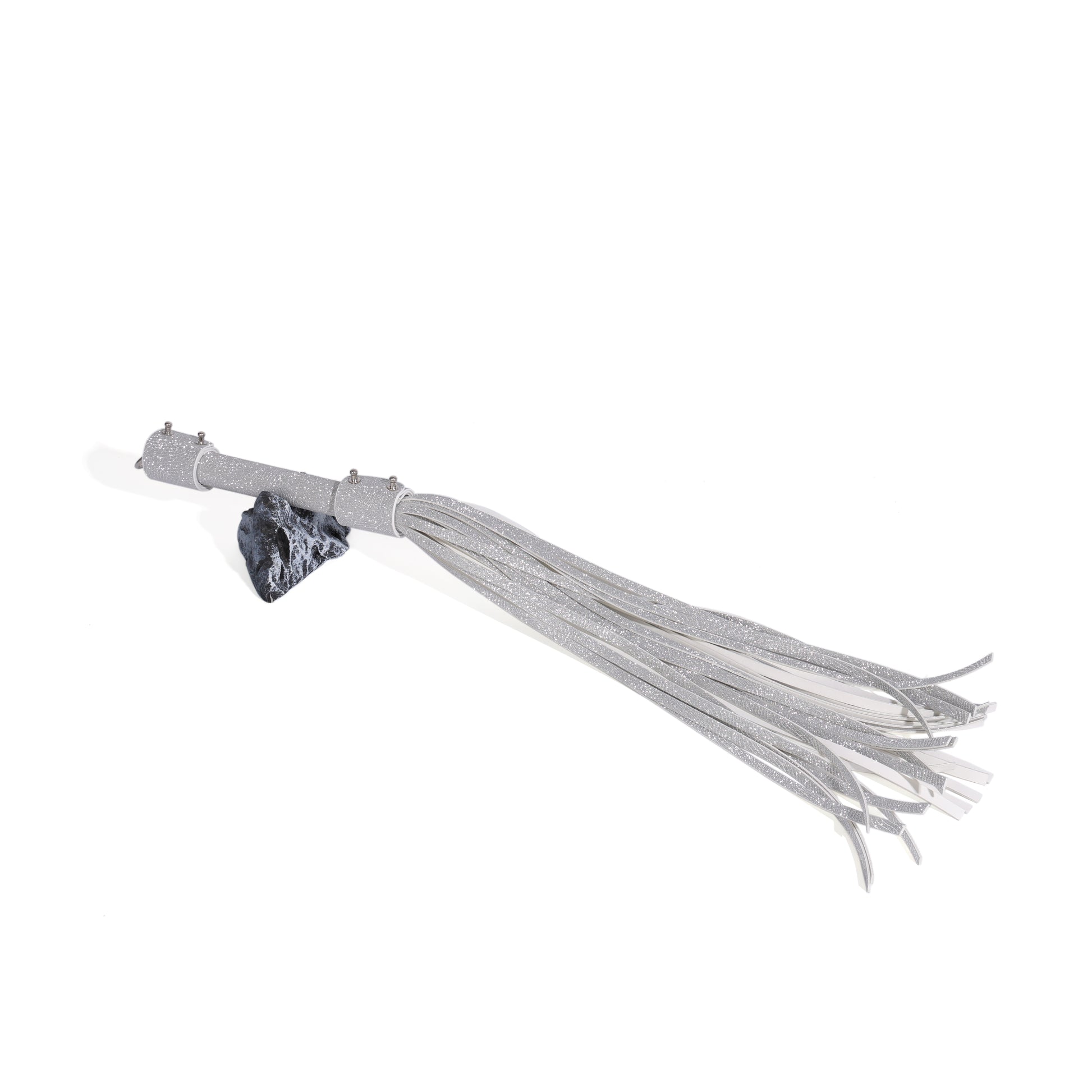 Match your sparkle. Magnify your sting. Complete your glittering command with the perfect accessory to match. This 60cm flogger is crafted from sumptuous white faux leather, each fall densely coated in the same guaranteed no-shed silver glitter as its bunny mask counterpart. The handle is meticulously wrapped and secured with sleek silver studs, culminating in a polished half-ring at its base—ready to hang, display, or be seized at a moment’s notice. Beautiful enough to admire, and built to be used.